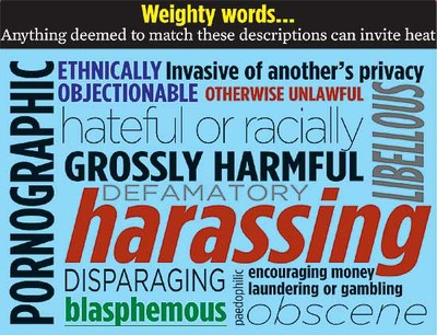 The new rules provide that anyone can complain against any online content if he thinks it is objectionable and breaches any of the keywords provided under the rules (see graphic). Chakshu Roy of prs Legislative Research, an independent group, says, "The keywords provided under the rules are rather too open to interpretation. This might lead to potential legal complications for internet companies who derive value by allowing people to interact online."