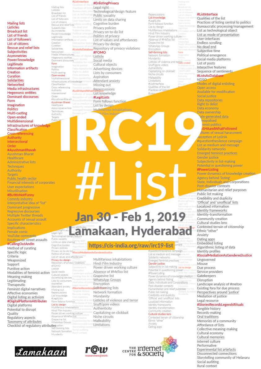 For the last several years, #MeToo and #LoSHA have set the course for rousing debates within feminist praxis and contemporary global politics. It also foregrounded the ubiquitous presence of the list in its various forms, not only on the internet but across diverse aspects of media culture. Much debate has emerged about specificities and implications of the list as an information artifact, especially in the case of #LoSHA and NRC - its role in creation and curation of information, in building solidarities and communities of practice, its dependencies on networked media infrastructures, its deployment by hegemonic entities and in turn for countering dominant discourses. Directed by the Supreme Court, the Government of India has initiated the National Register of Citizens process of creating an updated list of all Indian citizens in the state of Assam since 2015. This is a list that sets apart legal citizens from illegal immigrants, based on an extended and multi-phase process of announcement of draft lists and their revisions. NRC is producing a list with a specific question: who is a citizen and who is not? UIDAI has produced a list of unique identification number assigned to individuals: a list to connect/aggregate other lists, a meta-list.